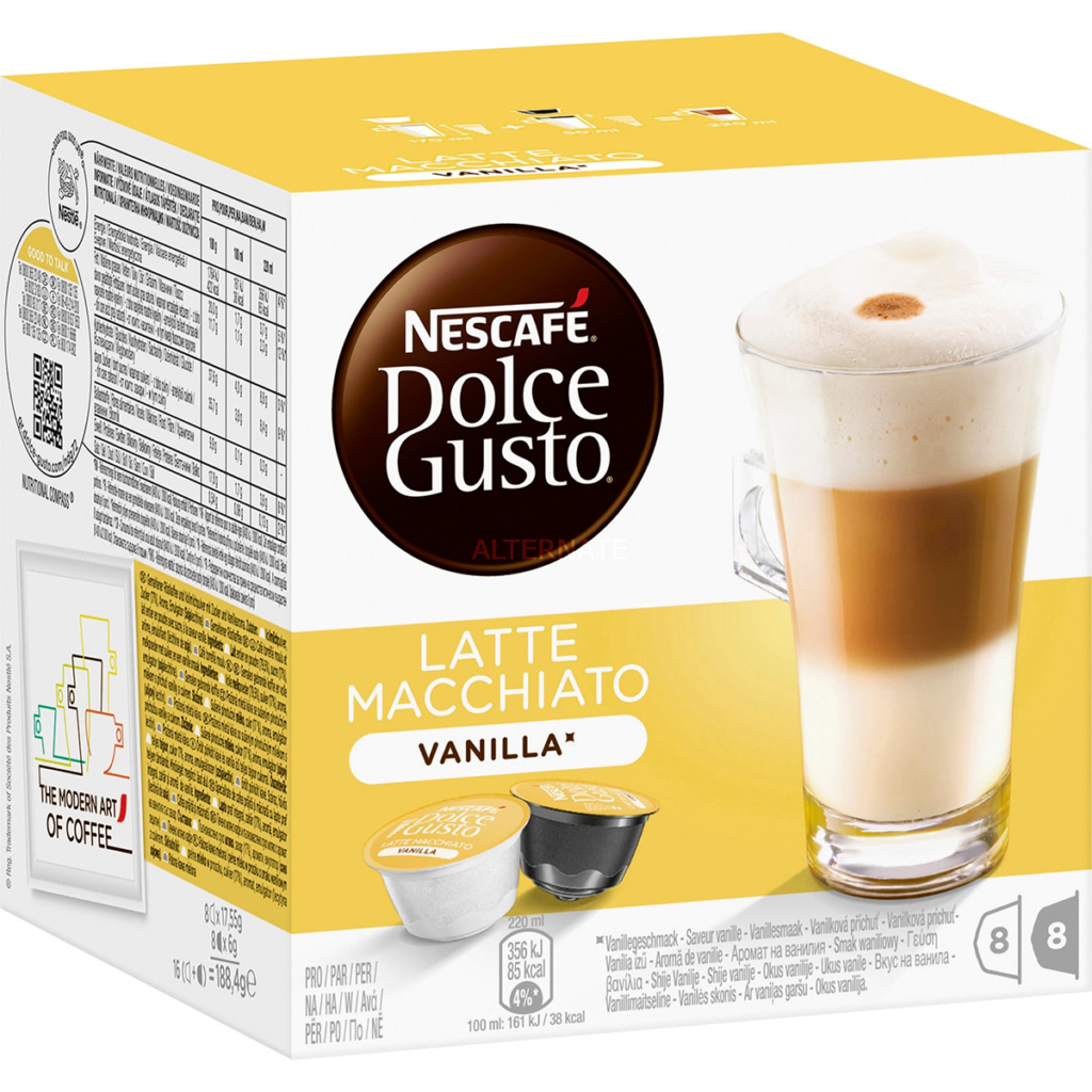 Dolce Gusto Latte Macchiato Vaniglia è una bevanda con tre strati: latte caldo, caffè espresso macinato e una schiuma di latte aromatizzata alla vaniglia. Si presenta in due capsule, una per il latte, l’altra per il caffè.