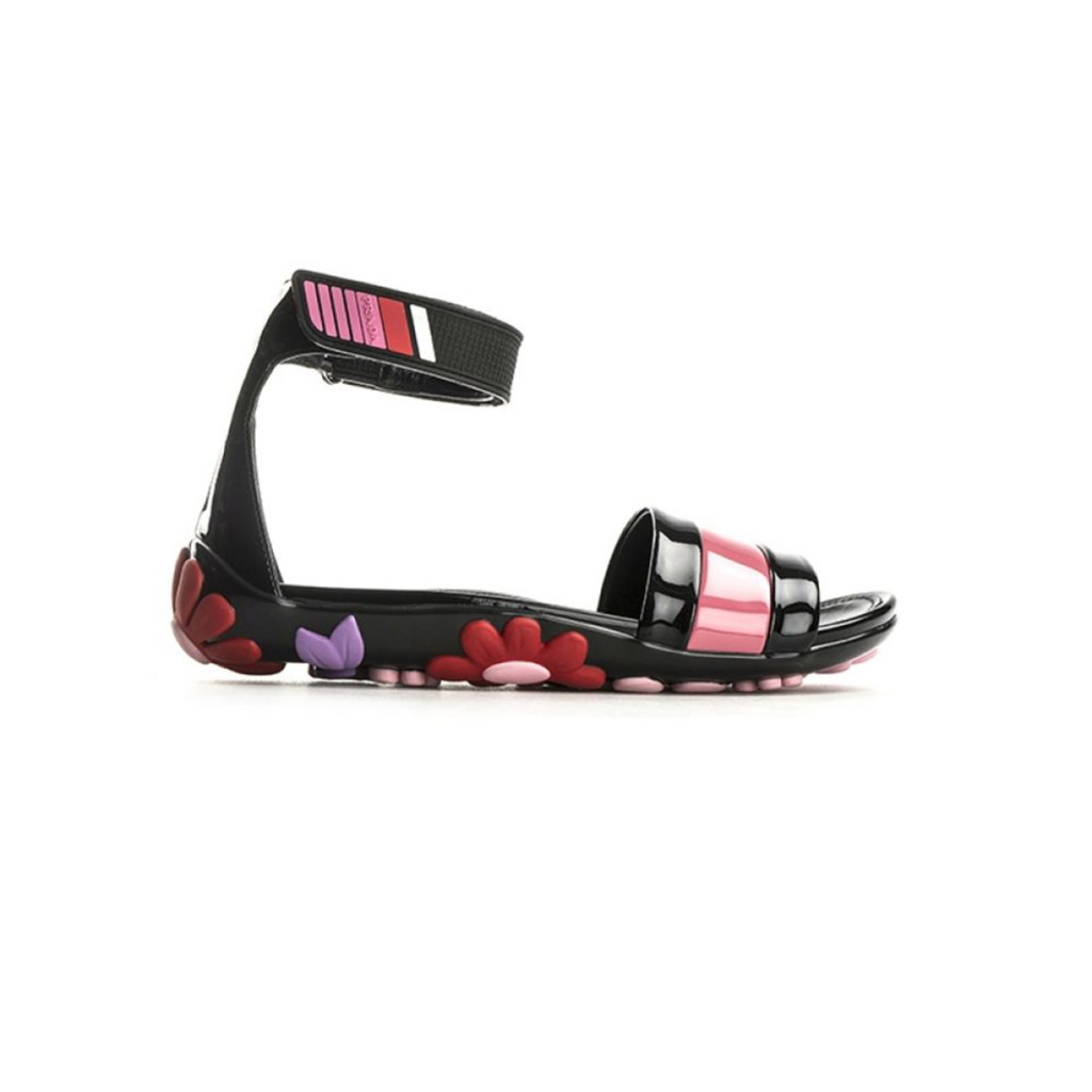 Sandalo Prada da donna, originale e colorato con tomaia in pelle nera e rosa verniciata, cinturino gommato a strappo alla caviglia e suola con fiori colorati gommati in rilievo. Può essere facilmente indossato con qualsiasi look, non necessita di particolari abbinamenti. Può essere inserito sotto una gonna, un pantalone elegante o un jeans.
