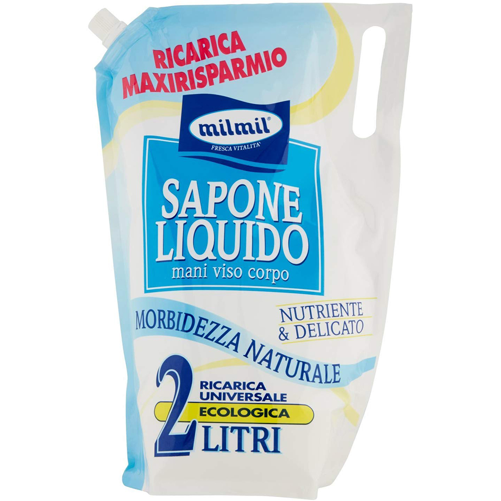 Ecologico: questa confezione vale 4 flaconi da 500 ml, 2 flaconi da 1 litro, 8 flaconi da 250 ml delle più comuni marche. Acquistando MilMil ricarica 2 litri risparmi subito il costo dei rispettivi flaconi e contribuisci così a ridurre l’impiego della plastica non biodegradabile e il volume dei rifiuti.