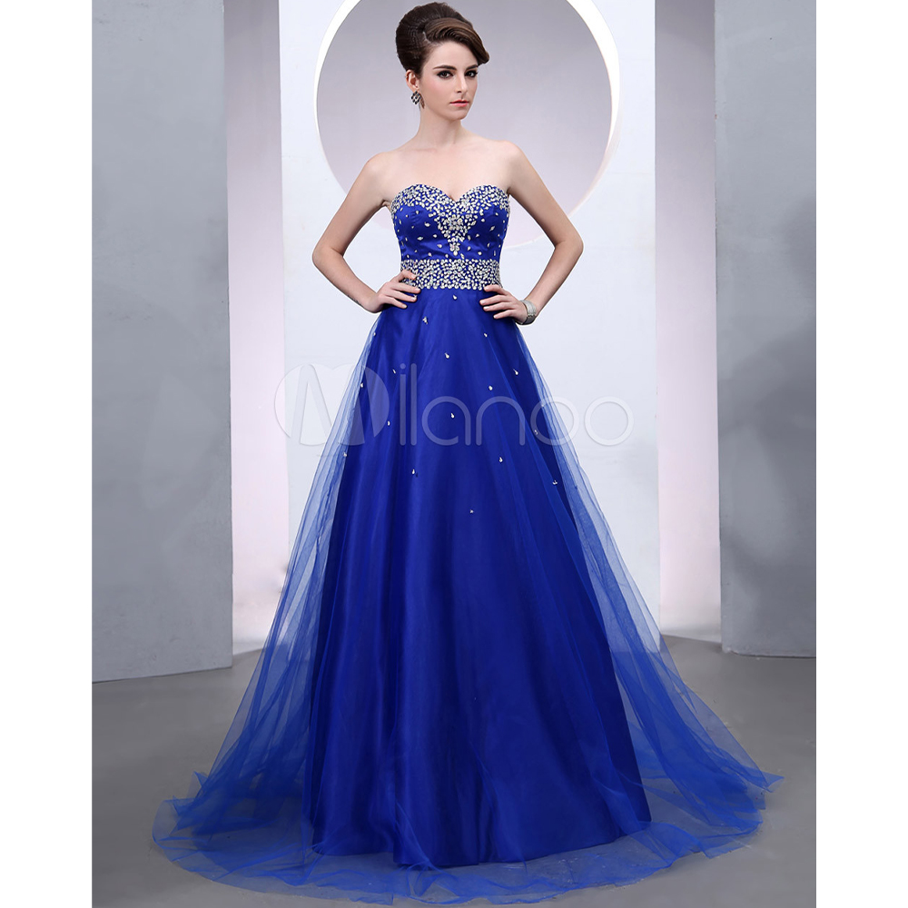 Abito da sera sexy con perline in tulle blu royal a terra