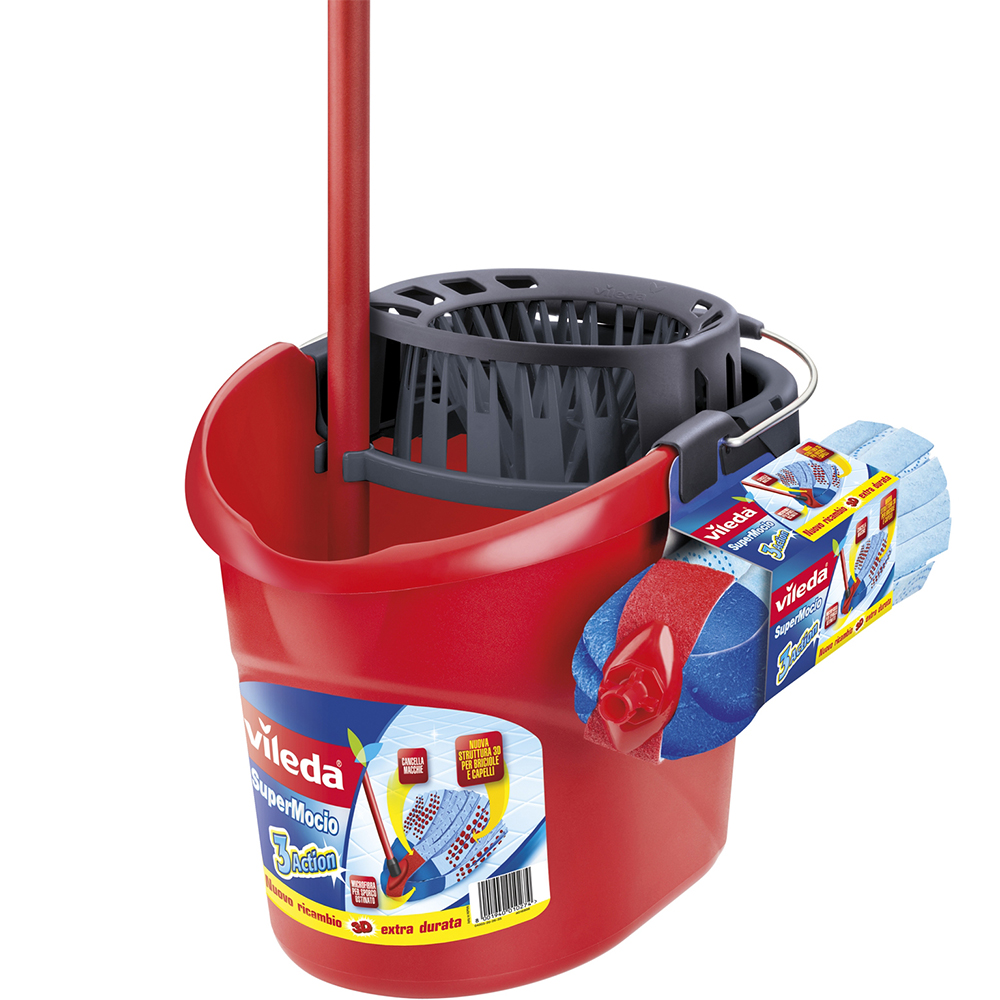 Il Super Mocio Vileda è un mocio lavapavimenti dotato di un manico diviso in tre pezzi. Si tratta di uno strumento adatto per la pulizia quotidiana: questo lavapavimenti con secchio permette una strizzatura efficace con molta meno fatica, il tutto grazie allo strizzatore Torsion Power.