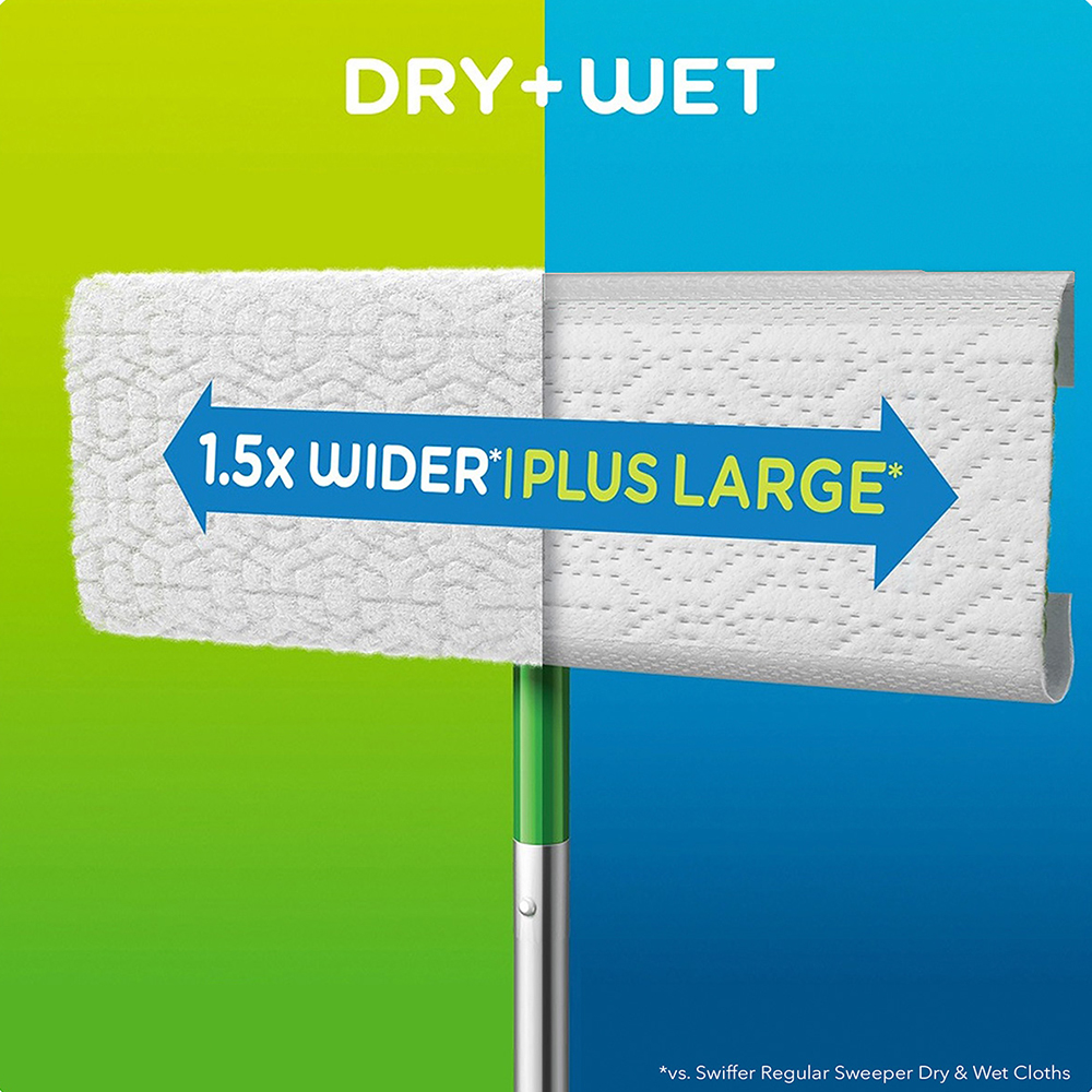 1,5 volte più largo del normale Swiffer Sweeper, copre più terreno. Ottimo per grandi aree e grandi progetti. Utilizza panni asciutti spessi extra-large che intrappolano e bloccano sporco, polvere e capelli. Puoi anche usare due panni bagnati Swiffer Sweeper per affrontare sporco e sporcizia.
