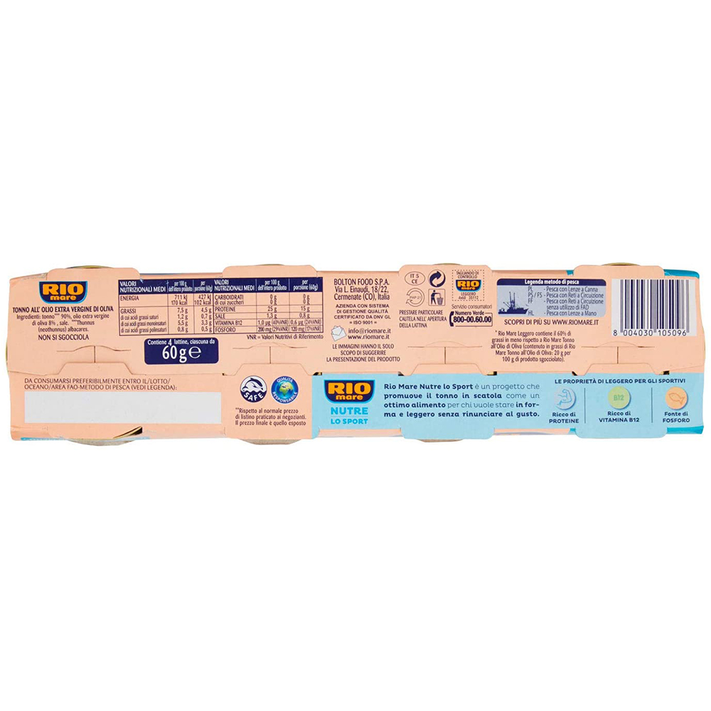 *Rio Mare Leggero contiene il 60% di grassi in meno rispetto a Rio Mare Tonno all’olio di oliva (contenuto in grassi di Rio Mare Tonno all’olio di oliva: 20% sul prodotto sgocciolato)