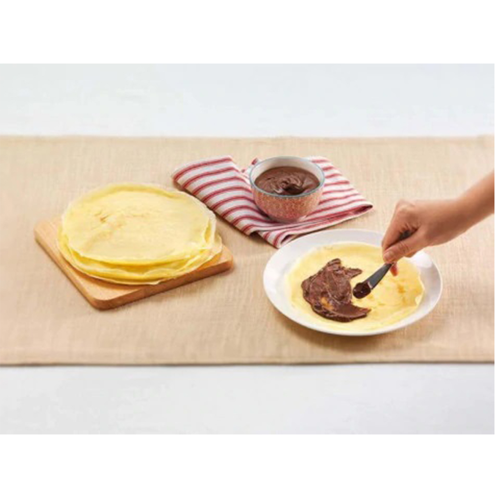 Cuocetele su tutti e due i lati finché non raggiungono una doratura uniforme. Servite le crêpes farcite con Nutella® (15 g ciascuna) e frutta fresca a piacimento (banane, fragole…).